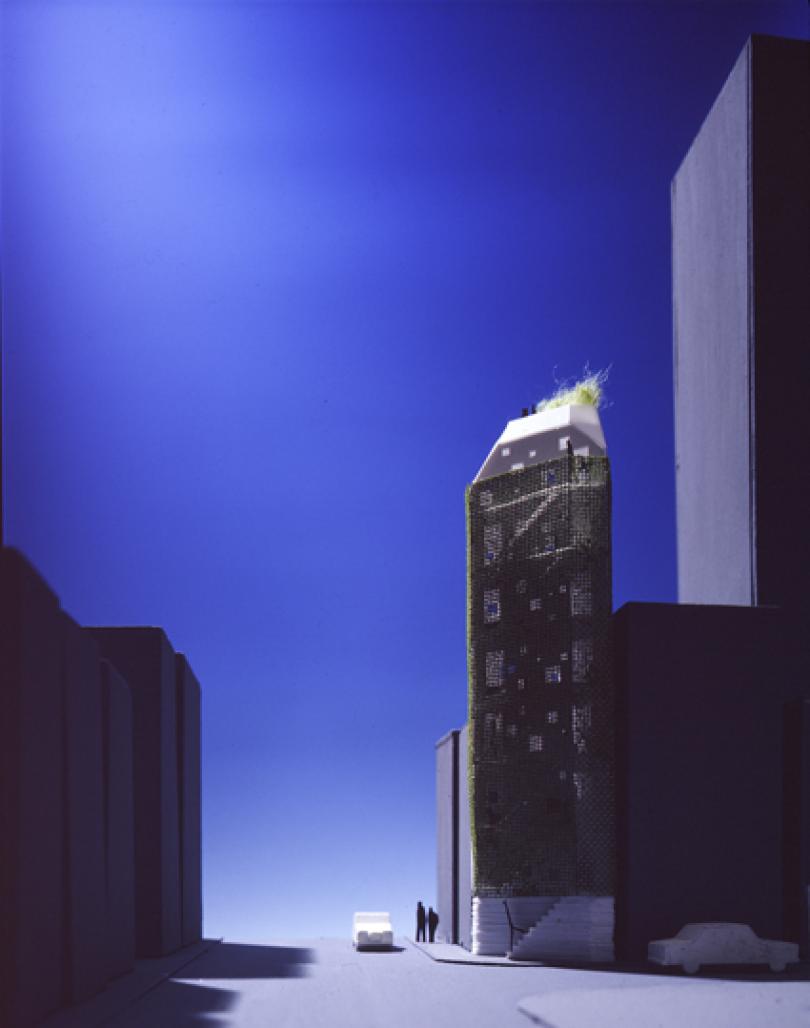 Although it is the site of 90% of building coverage, and 400% of floor area ratios, it does not dare secure internal space to the limit of plottage, but is considering as the form of the shape of tower of seven layers. 1F and 7Fare made into share spaces and 2F is made into a bathroom, and 3F-6F are made into the single room . The common stairs which connect the upper and lower sides are made it external stairs considering the marginal value of total floor. However, the space functions as a buffer belt which builds distance with internal space from city noise with the green screen currently planned to the road side.