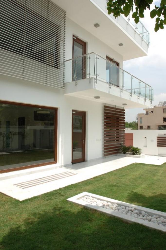 The exterior boundary wall kept simple in keeping with building concept. Where in the side boundary wall in driveway has multiple panel in continuation. One enters into the lobby through an interesting glass steps with water flowing from side to the bottom of it creating dramatic effect. The lobby, a common space leads to drawing room in the front and staircase leading to just floor. The drawing room, lobby and family lounge has been kept in same axis connecting two ends of site visually and physically. The interiors has been kept very modern and elegant.