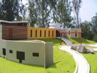 The master bedroom & office area defined by semicircular shape is placed on other side of entrance lobby. One gets a good view from the master bedroom of the swimming pool area. The steps from dining room leads to the lobby of the lower ground floor which can be approached from outside also. The lower floor houses three bedroom the form derived from the contoured shape of site. The terrace of the guestroom area is used as a terrace garden approached from the kitchen area which give a good entire view of site and its landscape.