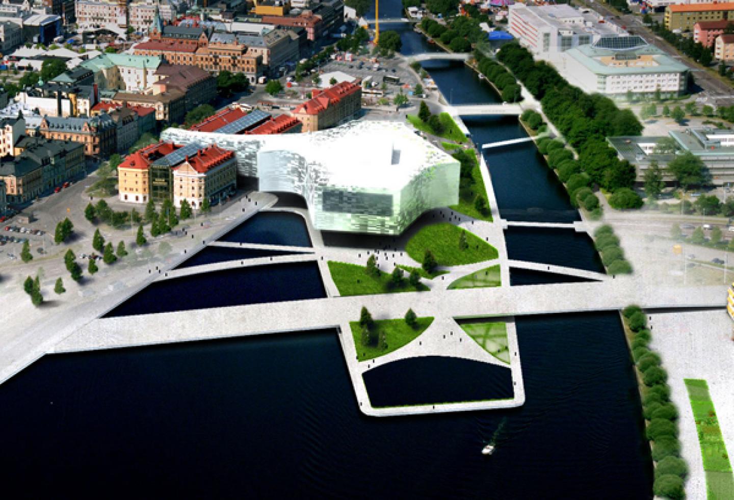 The townhall wants a new theater directly connected to the existing culture house. The planned higway complicates this. Placing the theater east of the highway as a solitarian building with view over the sea would be desirable. an icon ending the city. placing the theater west of the highway will make it possible to connect the building to the existing culture house and make the buildings contact to the rest of the city more obvious, but views and contact to the sea would be obstructed by the highway.