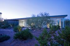 The one-acre site is within a single-family residential neighborhood, surrounded by textured desert mountains to the south, west, and northeast. The pure structure cuts a clean sharp edge through the revegetative desert landscape.