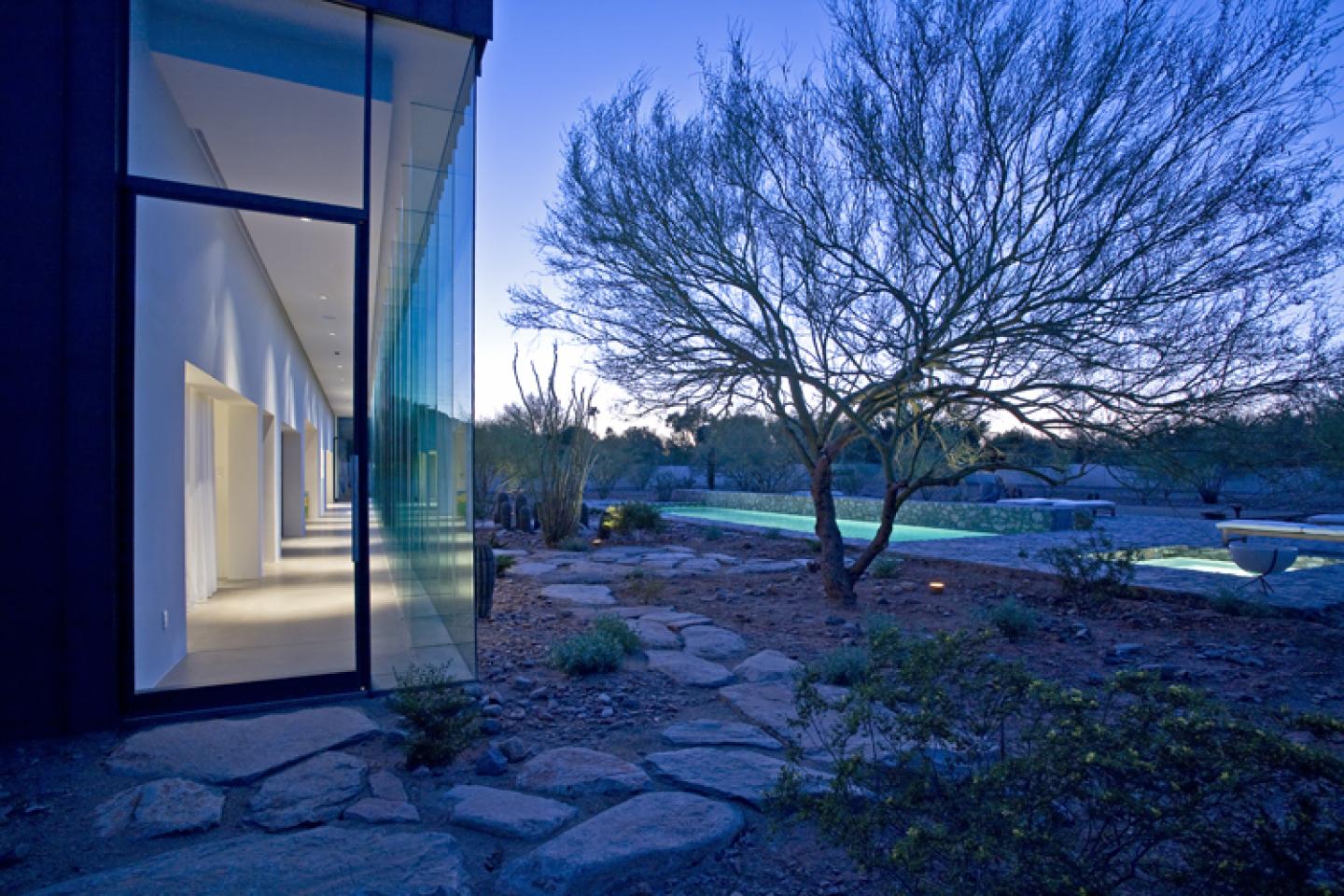 The one-acre site is within a single-family residential neighborhood, surrounded by textured desert mountains to the south, west, and northeast. The pure structure cuts a clean sharp edge through the revegetative desert landscape.