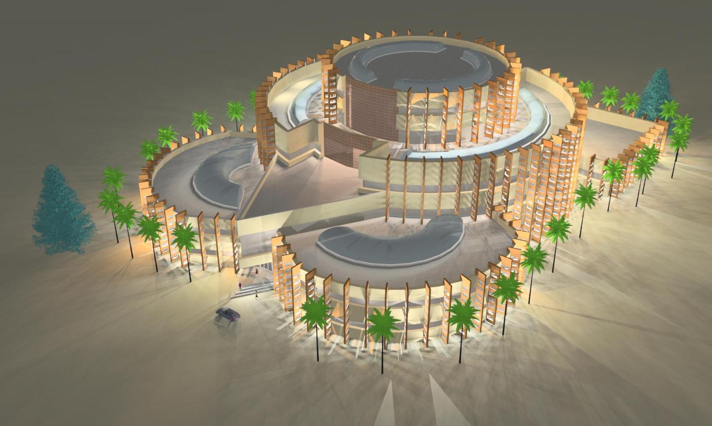 I designed this Shopping Mall on the bases of symmentry concepts. I picked the form of Tortorise and convert this form into inorganic forms of regular patterns. In this Design I care Alot for natural Light. I Provided Solar Panels in the Ribs of exterior walls to Generate Solar Electricity through solar Panels. Because here in pakistan there is shortage of electricity. i provided Ecuvator Room outside this building to store the generated electricity through solar panels.