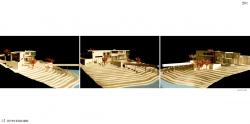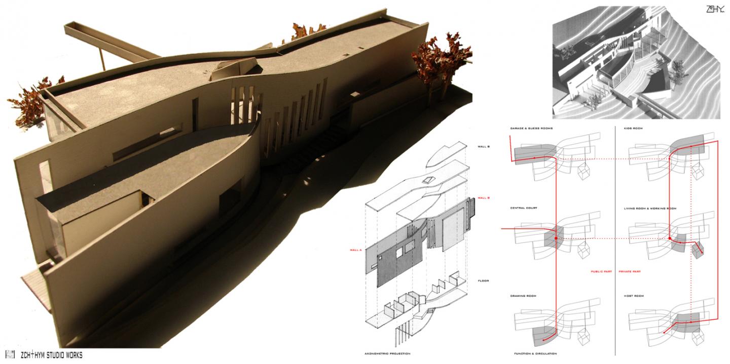 this is a villa for one family which has 4 peoples, husband, wife & two kids. located in a hillside riverbank, the site is facing to the river and crowded with lots of natural landscape. the opposite of the river is also focal landscape-view which forms the visual axis of the site. in this project, we will deal with 4 problems, as follow: 1.we tries to let the building naturally lie in the riverbank & match terrain without destroying valuable elements of surrounding, so that we set up twin-walls to suit the terrain line & determinate levels of each space to balance the terra; 2.main view direction will face the river and its opposite to exploit the remarkable landscape of the site, also we will maintain the natural visual axis. 3. most of plants in the site will be reserved to a comfortable inner-environment and make the house undercover in it; 4. the main idea of that project is that we attempt to interesting spaces to fit the complex s of daily life by using the minimum wall, and this purpose will be realized by the two subtle twisted walls. the building formed by twin-walls has graceful contour, mutative & artistic quality that also match the status of the client who is an artist.