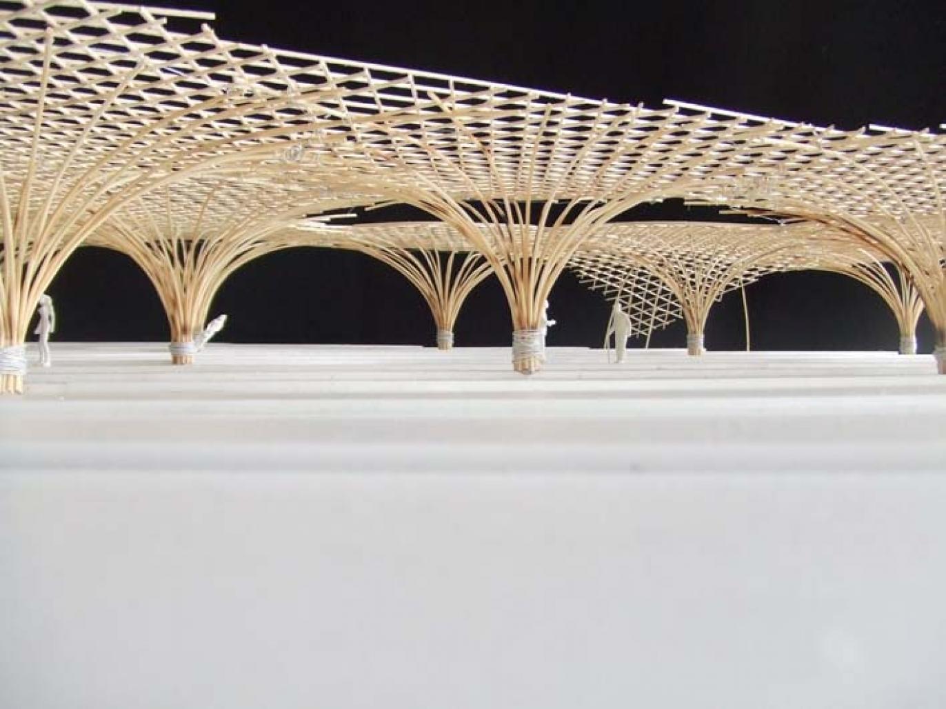 We designed the structure made by bamboo from the image symbol of water network and some hut around it for activity like workshop for art.