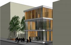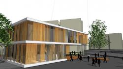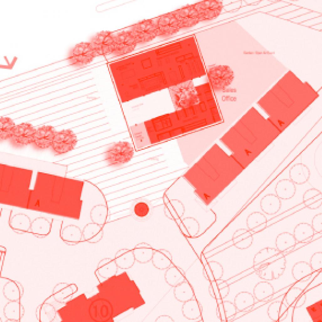 Temporary Sales Office. Modular Construction allowing different site-specific Constellations: Structure can be disassembled, transported and reassembled in a different location. Technical Services travel as box module with structural modules. 3 different Typologies have been developed to respond to generic sites such as: brownfield / suburban location, public space, inner city block.