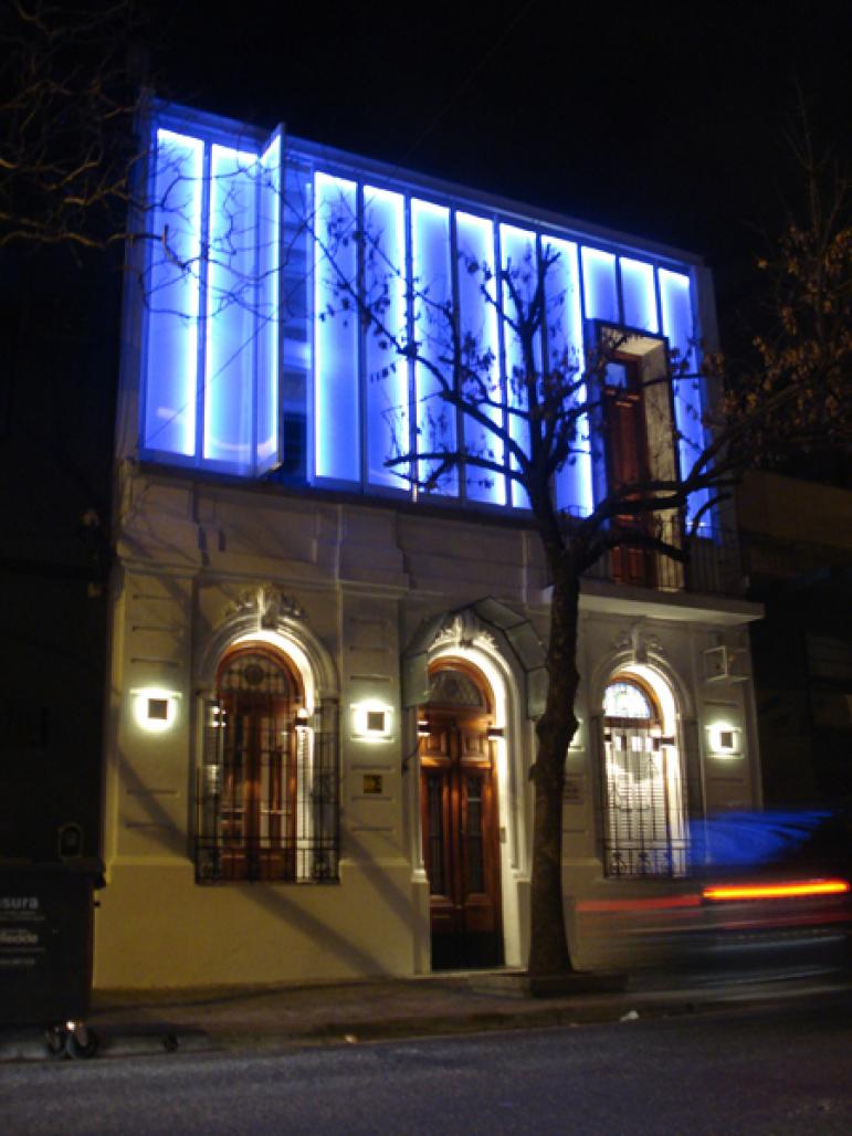The building is located on the street Niceto Vega artery under constant development in the neighborhood of Palermo. As building in the location always understood the importance of their presence, both in terms of its architectural imprint to turn program. The speed and features that street lights were the subject of analysis when studying the proposal, critical assumptions as a starting point to reflect on the duality between the response from the facade of the building outward, on the one hand, and towards the inside, on the other. It worked then, developing the idea of the facade as a turning point between the search space related to the internal static-perceptual and expressing the foreign language of the dynamic absolutely linked with the vehicle dynamics. In return, the internal statism. The building works on cutting, achieved through a staggered series of courtyards and floating mezzanines, quiet space for contemplation and perception. Indoor interrelated through continuous visual and intentionally directed to the outside, the centers of light, in search of the sky and the green, achieved under the full opening of the space through aventanamientos completely stripped of trim and Parant. Were designed and manufactured metal frames that dodging the concrete structure, hugging the big pieces of glass, forming the whole of the interior façade of the building. Based on the decision to retain the most genuine characteristics of the house - typically Palermo - the project proposes an integration with the existing relations since the modern and contemporary, as well as paying tribute to the original construction. We were interested from the beginning to reinterpret the relationship of the facade to the outside, almost like a type of signage back-light producing a tension, a movement, a dynamic game, one intention of colors in response to external reality. This transaction front agile, light and modern relies on the robustness and soundness of the original facade, composing an all closely related and tectonics. As a result there is a sequence of 12 slender postigones materialized pivoting polycarbonate grinding of 4.20 m in height by 60cm in width placed in metal racks, allowing the versatility of opening on the front, sweeping the spectrum of stage A (closed facade and tight) to a B stage (facade completely open). Each one hides postigon Leds RGB system that allows the dye front as the color and the desired color sequence. Any impression of this device as contemporary classical facade of the crown and in turn is separated from it by a ribbon of concrete on the front that runs from side to side. The mere idea of the building structure and focus to your inner world took the result of capturing an oasis full of vegetation and making it an integral part of all, to somehow preserve the essence and character of the original dwelling. There throughout the site with the premise of working almost obsessively on the contact points between the old house and new work. These are always points of tension from the architectural point of view, which undoubtedly require our attention, study, reflection, and solution design. In both the primary and general decisions of the project, as the resolution of the smallest detail, encounters between the old world and the new world offer a particular care, since the design and materiality. From a technological point of view, the project responds to the same premise. The book serves as an early-century house that assimilates the latest technology. Since programmable circuits lighting up air-conditioning systems with ecological concepts of energy conservation through zoning audio and high definition video. As designers we were interested from the earliest traces of the design to respond to this task under the slogan of the wealth space, use of materials, sincerity constructive, calm colors, and the preservation of the green, making a container designed to dispose off prominence to the total pieces<
