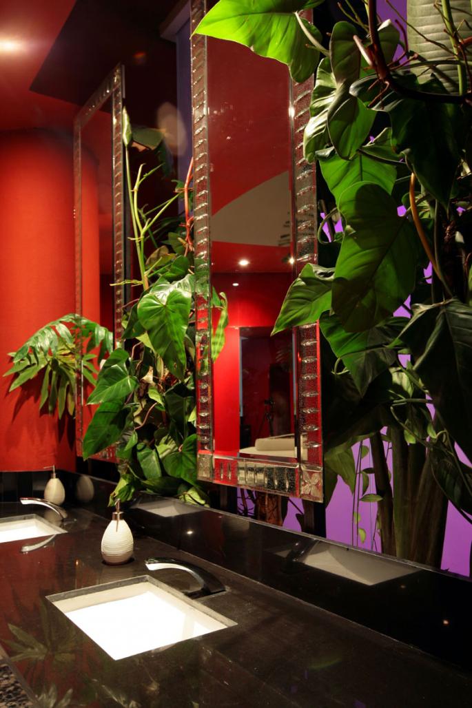 Restrooms are a gathering place completely covered in glass; the women’s area is in red with a white bench and a huge palm tree at the center, in the men’s section the glass is black and blue with a central triangular decorative planter with exotic plants.