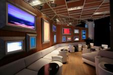 A dark foyer leads to completely covered in wood lounge decorated with small groups of sofas that have a view of an outside smoking area. At one end there are several screens framed as pictures in a living room and on the other a 15 meter long bar counter and further up, at the back, a same size by 3 meters height hi-res video screen. The bars under counters display a geometric design and are light up by changing color leds.