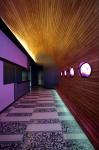 Access to the premises is by a foyer that simulates the interior of a ship lined with wood, where five high definition screens framed as oval windows that may show either a clouded sky travelling at high speed or bottom of the sea images transforming it into a submarine.