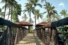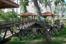 A wooden bridge which is interestingly designed connects the four kiosks. It suspends over an artificially created water body. It is constructed of wooden logs .The side rails are designed of horizontal iron bars and chains attached to wooden struts topped over by a wooden log as a hand rail. The structures are meticulously designed with proper attention paid to each construction joint.