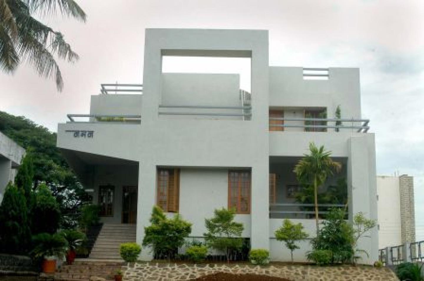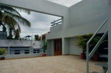 A simple building with combination of plain forms in plan and elevation with an impressive white shading on the external facade.Appropriate plantation is seen in surroundings.The spaces are unobstructed and show a clean flow with minimal walls .An eyecatching staircase forms the focal point with a dry landscaping at the central core.Interiors are treated in co-relation with the simple and open forms.