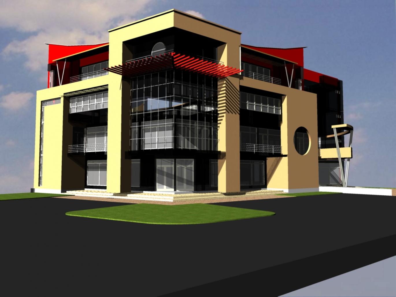 a prominet corner plot in an urban area called for the articulation and celebration of the corner in this mixed urban use building in mukono, uganda.