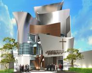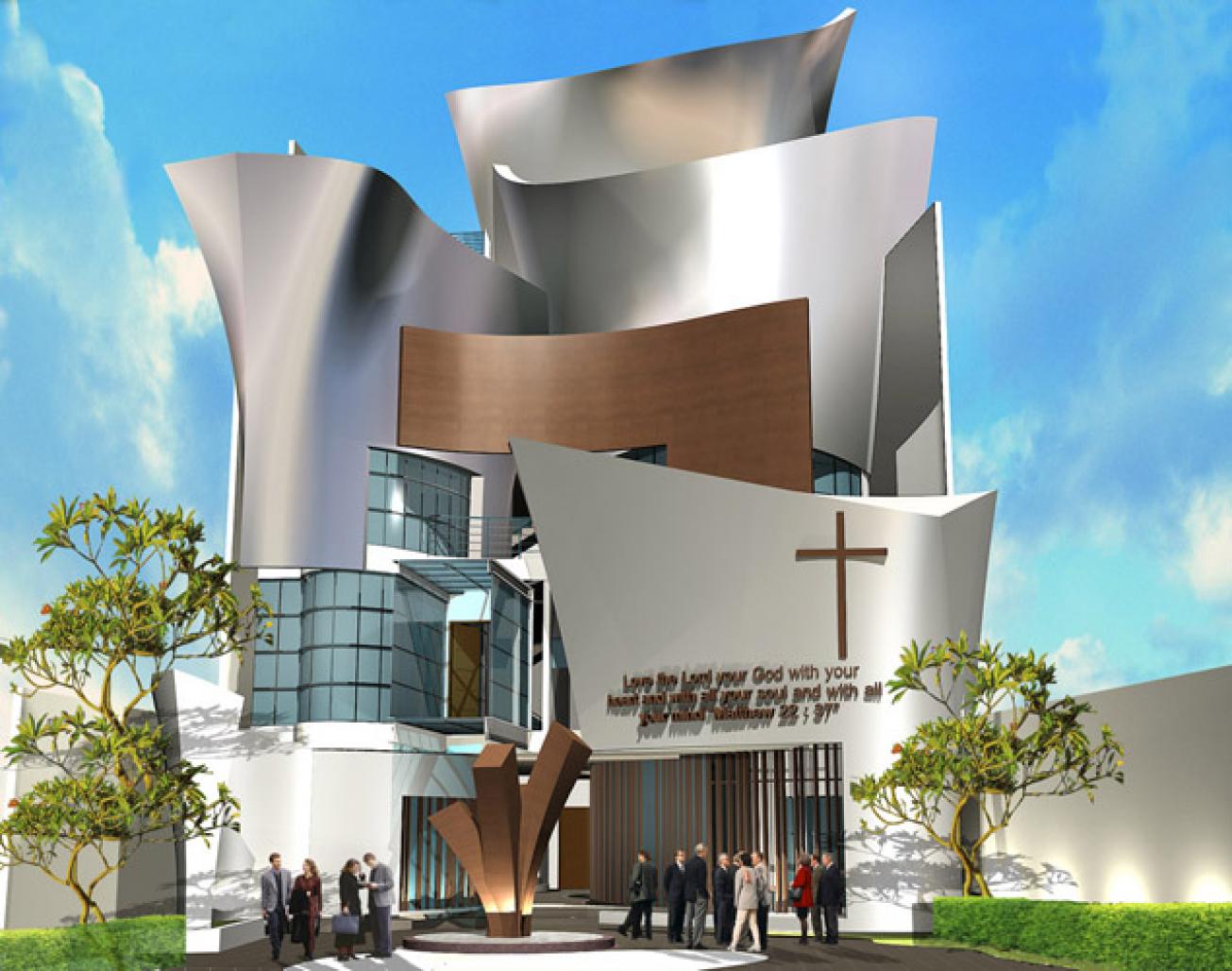 This was a proposal design of GKMI Church of Wisma Anugrah that designed in contemporary form with curvilinear shades of facade. Every spaces created in order to make spacious movement of curve. The existing structure had been already built in grid construction, but with any reason, the project was stopped to redesign into the new form, interior and exterior were changed to make the building more comfort and functionality for youngest user of chapel, library, class rooms, and other. The building facade make from alumminium clad with steel construction to support it and form make the church"chapel look dinamic and uniq. Portfolio Architectural Lifestyle (Julio Julianto, Rhein C.Gozal, Ho Chung-Chung, and other designers involved) created this one proposed design in different form between others.