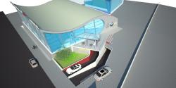 This is an extension of an existing car dealership just outside the city of Chalkida, Greece. The lifted ground floor hosts the car exhibition and the salesmen’s offices whereas the car repair workshop is located in the basement of the building.