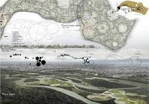 The park is an extension of urban water systems and cross-town, its nature, parks and institutions. It complements the urban life, an encounter with the water and sky. The malecon, as the boundary of the city`s public space is the first contact with the park, a visual screening approach for natural dense vegetation of the islands, where above it is suggested the project. Access is generated as a projection of the cra 7, cultural and institutional axis ends in the square of meeting, multi-functional public space that is part of the city. Respect for the landscape and character of the project to restore the link with nature and the sky of the cultures that inhabited the river basin in its entire course, makes the intervention is grouped in the flooding areas, while respecting the natural ecosystem of the river and its natural feature of the landscape modifier. The park is a changing experience.
