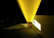 At the main entrance, the protruding roof helps create a concise urban space. The wide edge of the roof curves down to create a funnel-shaped volume which draws visitors into the building. The underside of the roof’s ceiling is covered with an angled metal mesh, so that its yellow color is not revealed until the visitor exits the building.