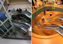 The transparent balustrade made of protruding glass pannels around the atrium along with the continuous, linear light strip over the glass store fronts and the homogenous flooring accentuate the new generous profile of the shopping center.