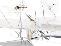 The gallery suspends the viewer from their physica; reality. Walkways mimic the motion of a water vortex moving around anchored objects, the surfaces in section puncture the upper deck flooding light into the gallery spaces below to create a floating space similar to that of a swimming pool. A suspended reality.