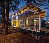 The project site was specifically selected to allow the owners to pursue their preferred lifestyle of walking, biking and using mass transit in their day-to-day lives. For them, minimizing their dependency on personal automobiles will result in fewer car trips and thus contribute to less pollution, congestion, less use of imported oil, and a healthier, more community-oriented lifestyle. RainShine, however, does occupy a challenging 1/3-acre site. Although the property is within sight of the subcontinental divide, buildable area is constrained by a man made flood plain (resulting from poor municipal culvert design and a huge nearby asphalt church parking lot with inadequate runoff controls), stream buffer requirements and a sewer easement transversing the site as well as the usual residential zoning setbacks. These factors result in a trapezoidal shaped 3,778 square foot area available for building. The house, porches and decks are thus tightly defined within these limitations but take advantage by orienting to the open space afforded through the easement and buffer.