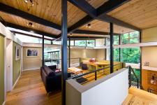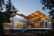 RainShines sustainability goals were paramount and achieved through passive solar techniques and devices (overhangs, south facing louvers, solar eyebrows, light shelves, increased insulation, operable solar shades, motor operated clerestory windows) as well as energy efficient systems (including natural ventilation, geothermal heat pumps, LED lighting and energy recovery ventilation). Additional features include: high efficiency appliances, extensive use of environmentally preferable/high durability/salvaged/recycled/reclaimed materials and products, zero VOC paints and sealants, no irrigation, drought tolerant native species landscaping and (through incorporation of rain garden and rainharvest systems) post project runoff equivalent to a woodland state. RainShine is the first modernist LEED Platinum Certified house in the southeastern United States.