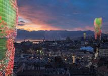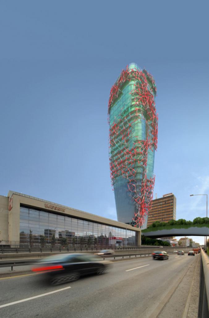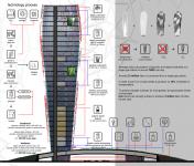 In combination with the form of the tower and the platform beneath, the outer skin layer of the tower is presented with a symbolic eco parasite tubular system for growth of algae.