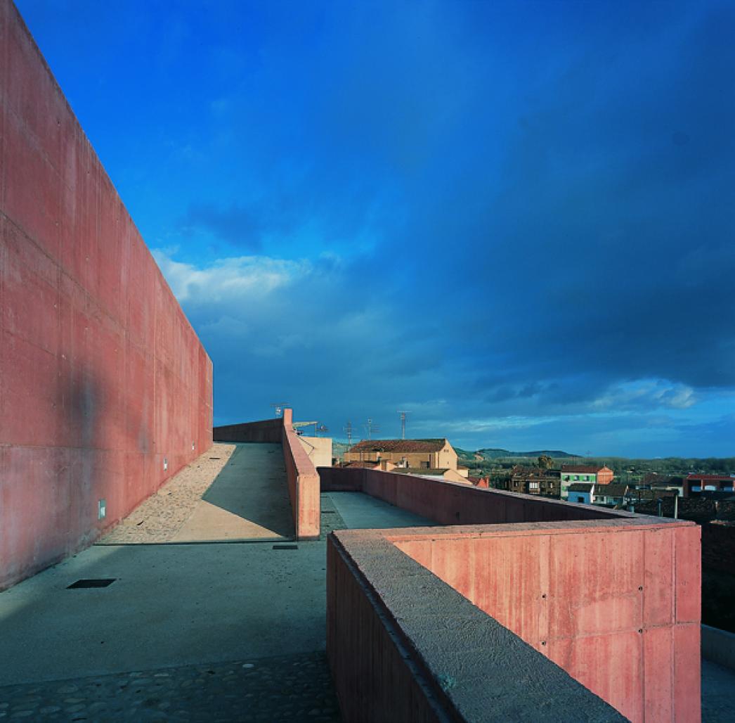 The walls were built with reinforced concrete dyed throughout with rust red oxides to fit in aesthetically with the large expanses of brickwork. The outline and texture created by the succession of walls, kerbs and level ramps is an attempt to offer visual variety, to safeguard existing unevenness, and to create places where the visual aspect, as the walker gains in height, gets more rewarding, through different levels and paved surfaces, and with views of San Adrián`s natural rolling town and countryside becoming superimposed on the viewer.