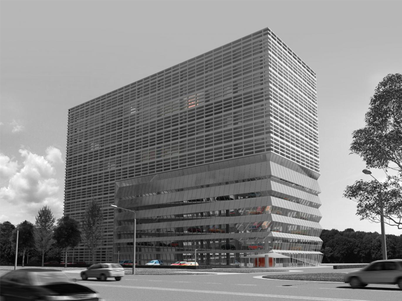 On a small plot between the main road and the forest, a monolith mass houses an office-centre and a car-supermarket. Both parts are designed by efficient principles, resulting in minimum energy consumption. For the office part, the incoming sunlight is controlled by the depth of the concrete facade-frames. As for the showroom, the folds in the glass facade regulate sun protection, reflection and transparency, while a spacious atrium naturally conditions the inner climate. The car-supermarket is organised as a continuous space with a gallery around this atrium. A visit is therefore an upward sequence of different perspectives, resulting in a lounge-bar overseeing the forest.