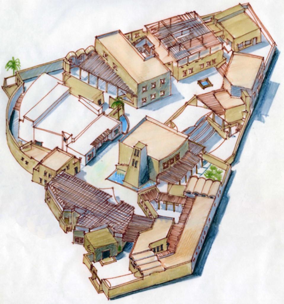 The cultural centre located in Siwa Oasis drew inspiration from the local indigenous architecture encountered during the visit .It’s primary aim is to revive the local crafts and enhance the quality of life of the nearby dwellers and also as an attraction to tourists where performances are held and products of the workshops are sold.The building site’s main view is a nearby mountain (called the western mountain) so the amphitheatre is oriented to this view. The forms are an outcome of space requirements flexibility of materials and roofing systems .It’s a form dictated by structure .Walls are made of rammed earth vaults are made of compressed earth blocks made from the local “karsheef “soil, a good insulator of heat(A mixture of silt ,sand & cohesive salt),except the indoor theatre It’s structure is a reinforced concrete frame due to it’s wide span . Its walls are of compressed earth blocks. The design incorporates elements to treat the harsh arid climate .There is a courtyard in the galleries easily accessible from the main entrance, and another one in the workshops area to provide ventilation .In addition to a large windcatcher in the indoor theatre and the outlet chimney. Which allows a draught that cools the building naturally