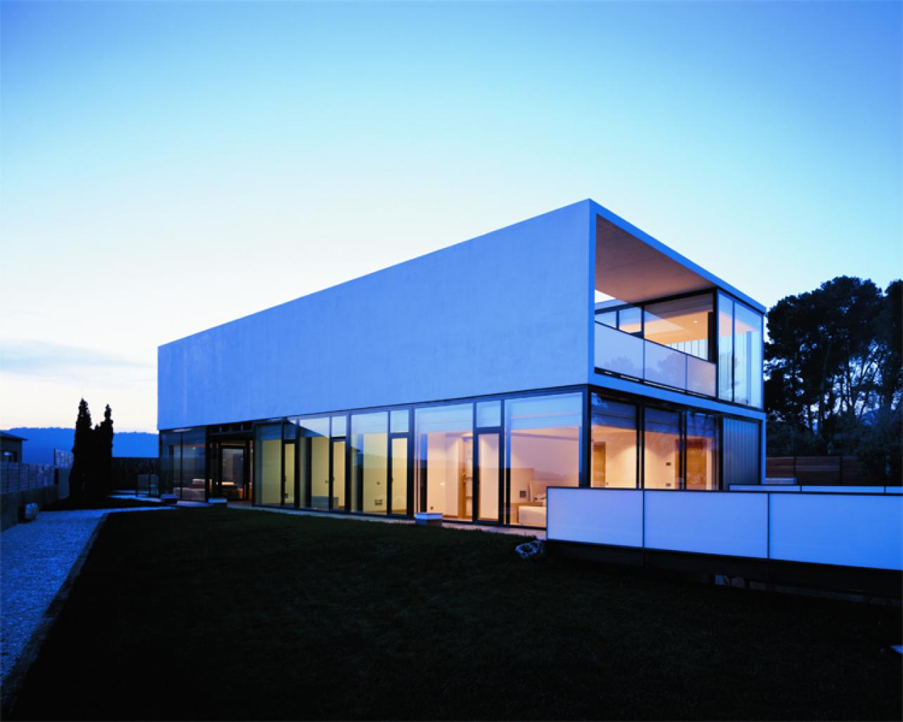 The structure-enclosure of the building works conforms to a whole which rises up out of the excavated ground, to a level which gives way, to a flagstone which is both ground and enclosure, wall and ceiling, so that the property bends alternatively to the south east and north west, according to the predominance of internal areas over the views, or subordinating to them. The fractured areas allow the bedrooms and the living/dining areas to stand out, with perfect direction, towards a garden, protected from the plots at the border by bland systems and dense vegetation. The first floor, on the other hand, seeks a uniform yet diffuse lighting system in the opposite direction, and at each end it looks out over distant views. On this floor, the opaque plane which turns into a distant image of the house protects the terrace, a patio open to the skies on the creased plane, a private and intimate spot in the property, a playful counterbalance to its strict abstract form.