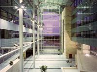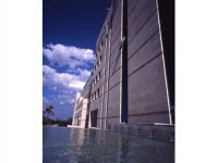 Solar panels can be seen shading the strips of window openings along the side of the building. Not only do they help regulate the internal ambient temperatures but through the collection of sun energy throughout the mostly sunny year they also provide the Electricity Authority with energy for their headquarters.