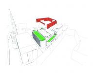 The façade surrounds the heightening like a volume and creates a transparent covering for the new parking decks. The density of the structure decreases from down upward. As a result of the transparency of the structure and the gene constantness of the material the existing solidium remains untouched.
