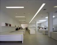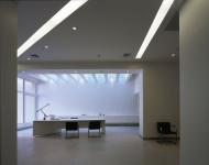 As the same way our studio was entirely white. Place in the first sub floor was an L shaped turn a patio of 11 x 11 mts that is the extension of our atelier and offices. Located in the first sub floor (in a 500 mts place) permit us to project our studio in a space with an interior height of 330 cms with very success natural light. The plan was not orthogonal, that permit as to tense the circulations and the space.