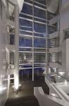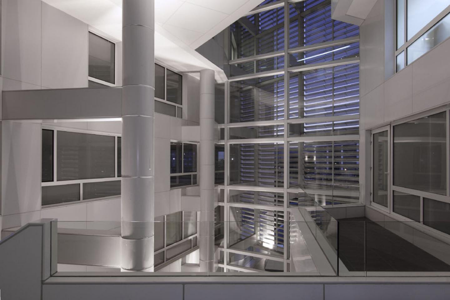The main idea of this white steel box is found in the internal hall. This interior is the heart of the building. The cubic volume opens towards the corner by means of a great six storey high crack. This void onto which all the levels balcony is open towards the west (the entrance), protected by a kind of great vertical grapevine which controls the afternoon sun. The interior space also received vertical light through a series of skylights. So, the total space was activated by the light but also by the circulations. Each level was different with none regulate form, that produce an irregular total space that crosses in all directions adapting to the different way of the slabs.