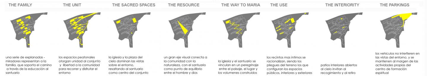 A series of esplanades as look-out points represent the family which walks the path by education towards the sanctuary. The 14 resting points along the path which goes connecting the architectural volumes, symbolize the 14 stations of the Passion. This path enters and exits from the earth, establishing private spaces which, permanently open to the sky, move you to self-communion and retirement in the same manner as the path of the Passion goes through suffering to deliver to us the wonderful news of redemption.