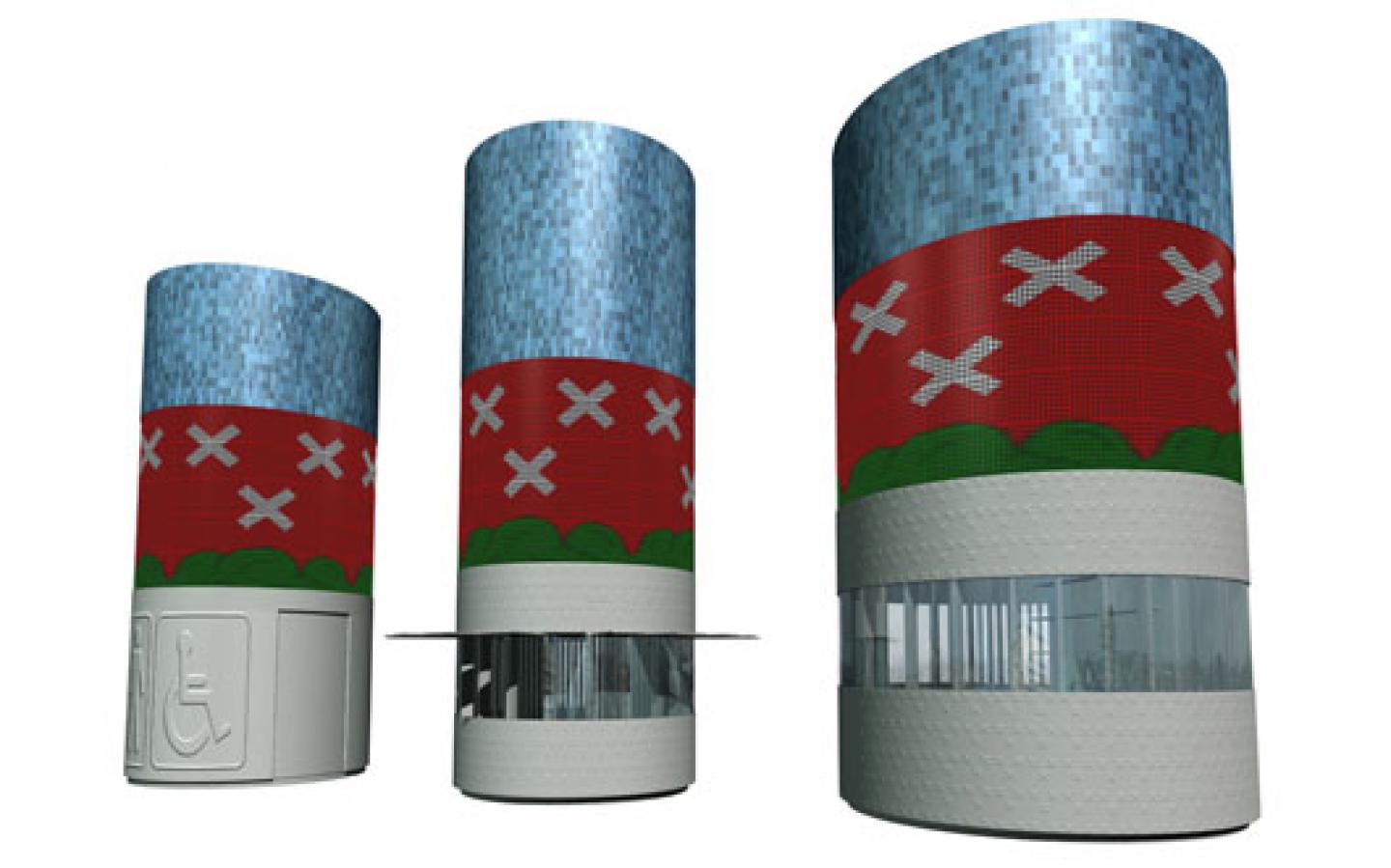 the design consisting of a series of self sufficient, sustainable kiosks. the system is inspired by the working method of jcdecaux: they offer municipalities street furniture, like bus stops, billboards and kiosks, for free and take care of the maintenance and reparation. in exchange, they keep the rights to exploit the commercial billboards that come incorporated in the street furniture.