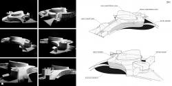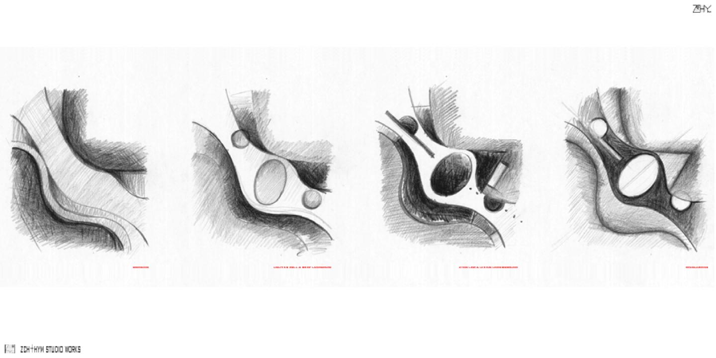 Concepts as below: By analyzing the situation of the city intersection, the building will be an “bridge ” to link the city joint to match the urbanism relation. we also analysis the line of sight from the city axis to avoid destruction by the trestle, the building will be controlling “flat” and sinking space will be used fully . In addition, 4 important functional mass bulge out to maintain the vertical volume city image. In order to provide an open urban space for public, it will be a landform building .the landform roof garden and the sinking courtyard will be a public park, people will be lead into smoothly, cultural activity will be held in this open urban space. Below the green roof, 4 elemental mass control the flat inner space, circulation will spread around them through the flat space. Light courtyard and sinking space create multiple layer space , outside versus inside, ground versus below ground , flat space versus plot space etc. there are 2 light courtyards impenetrate into the building vertically ,people interacting upfloor and downfloor , 2 sinking courtyards impenetrate in the building horizontally, one face to public part ,the other face to staff office, creating high quality landscape.