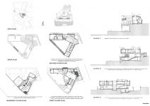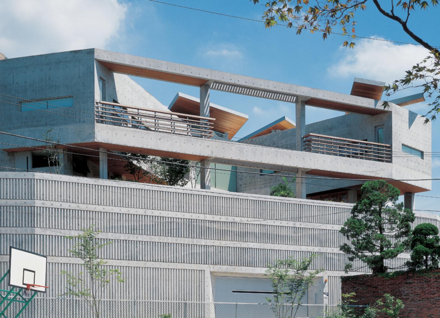 As always, many part of the design was decided by such site condition and client`s requirement. Finally, it reached conclusion to float an empty triangular shape concrete ring` which is similar to the form of site, on the high concrete axis. The form is decided by the aimed elements of design, such as `inflow of panoramic view`, `formation of `comportable garden ` , `keep privacy`. The two sides among the three side of the triangular site which faces adjacent site, are filled with mass. That is, centering around the living room, dining room on the first floor, pavilion, master`s bedroom on the second floor and children`s room become wings of both sides on each floor. By interrupting the visual interchange with adjacent house, the shape keeps privacy. The surplus side on the south side with fine view on the front road is intended to use as a floor of the bedrooms in both sides on the second floor, so the triangular ring was completed. A `picture` of last side of the floor is being a decisive `picture` that complete the character spatially/formatively. It softly surrounds the inner court, so characterize the space sense. Moreover, it operates as a pictorial frame that put a landscape. By expressing the own picture that translated the outside nature, the people inside could taste the preciousness of life, as well as, it will be a windpipe that bring the outside into inside. In addition, it adapts to around the front roadside formatively. The composed triangular ring shows strong power by itself, and it is expected to balance between the nature and power in sympathy with geographical features of mountain and altitude nearby.