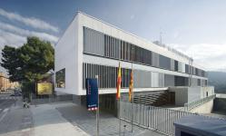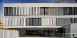Where the building overlooks Avinguda de les Mancomunitats comarcals, the upper parallelepiped projects beyond the ground floor, forming an eave that shelters the building’s entrance, creating a space of transition between the street and the interior.