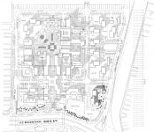 SHASTRI PLACE has been conceived as a CUBOIDAL SPACE on a 250 M x 250 M quadrangle opening out on the north west side towards the river .The main space is defined by four multi - storied buildings ( three twelve storied towers on the west , east and north east side and a seven storied building on the north west corner to allow for wind and to provide visual relief and comfort .