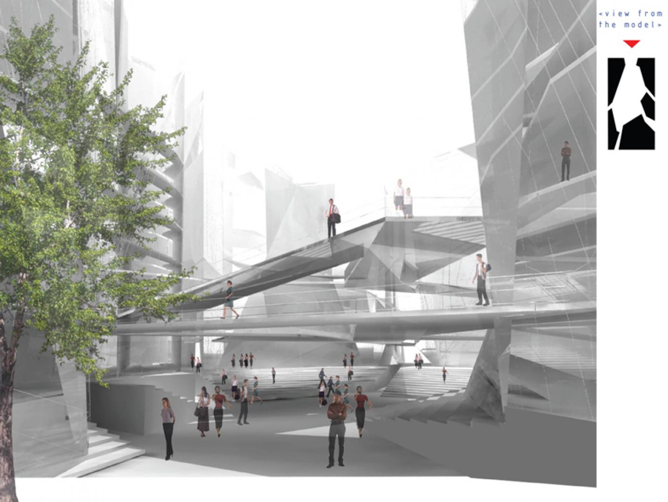 The main goal was to imagine a piece of land after a strong fire; the new life will be different without doubt. That’s why appeared different volumes which are responding for different functions but linked with bridges above.