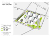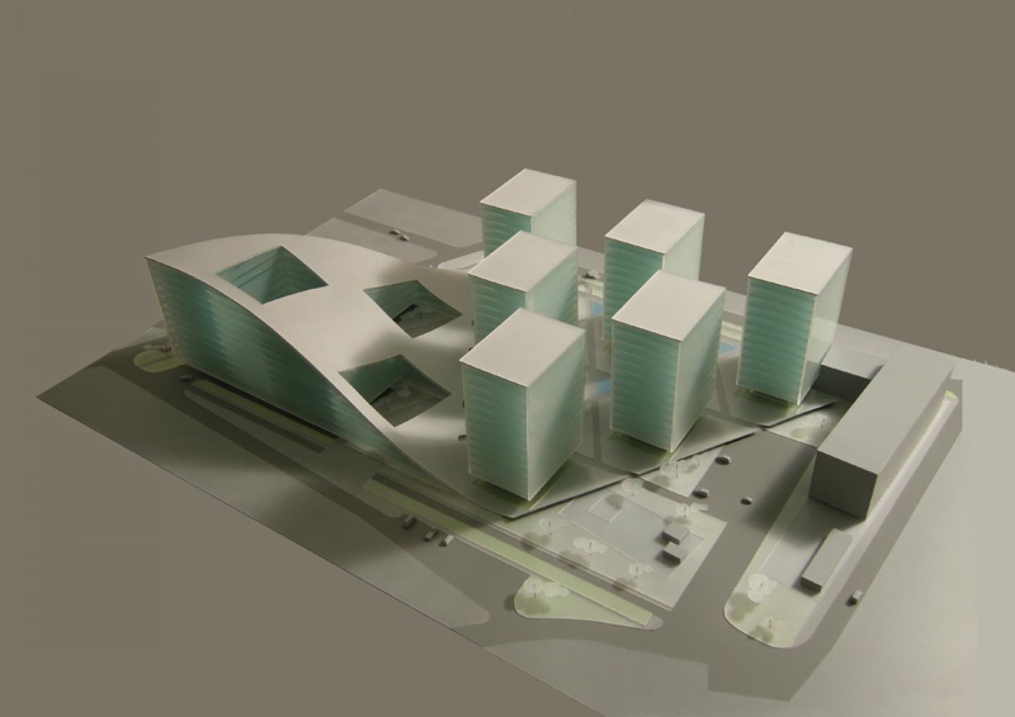 This industrial zone in the vicinity of the central part of Kiev is being gradually transformed into a new business area. The whole mass and spatial organisation of the complex is composed by separate tower elements and the main «hill»-like volume which houses office function together with all of the services: restaurant, cafe, day-care centre for children, pharmacy, bank office,fitness-centre, conference hall. All elements of the complex are inter-connected by means of a single diagonal grid, where its axes serve as main passages for communication, that go through public areas of open typology (squares) and those of closed typology (patios).
