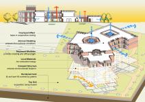 The building reduces its embodied energy by utilization of local materials including the clay brick & local stone. With a compact physical footprint, only 2 storeys and minimal paving, it promotes the natural water percolation & reduction of heat re-radiation. Passive Cooling is provided by vacuum insulation/ reflective roofs and adequate Day lighting design needs only supplemental energy efficient lighting design @4 Watts/sqm (66% saving vis-à-vis the standard). Equipment for preventing energy leakage and time based auto switching is provided from a collaborating electrical industry. Storm water is used for toilet flushing, floor-washing and horticulture. Water is also being used as a cooling eleme