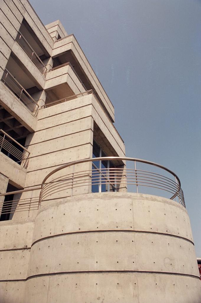 The design of the building is inspired from the serenity of the surrounding environment. The building is constructed of form-finished concrete along with the contrasting elements like glass and stainless steel. The whole composition of the residence is a play of solids and voids represented by projecting masses and terraces in some occasions or by deep recesses in others. The sensitive use of minute details, like steel railing, glass brick, marble, wood etc in the interior goes smoothly with the main concept of creating a peaceful homely atmosphere responsive to the unique natural setting. The intentional rugged texture of the concrete expresses its monumental character under bright daylight.