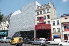 The silhouettes of dancers training inside visible from the street through the mesh layer is thought to create a large scale “peep-show” in addition to the neighboring erotic attractions of Pigalle. The metal skin resembling fishnet stockings worn by Moulin Rouge dancers as an essential element of eroticism is also deemed as an additional visual reference to the context.