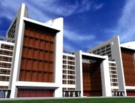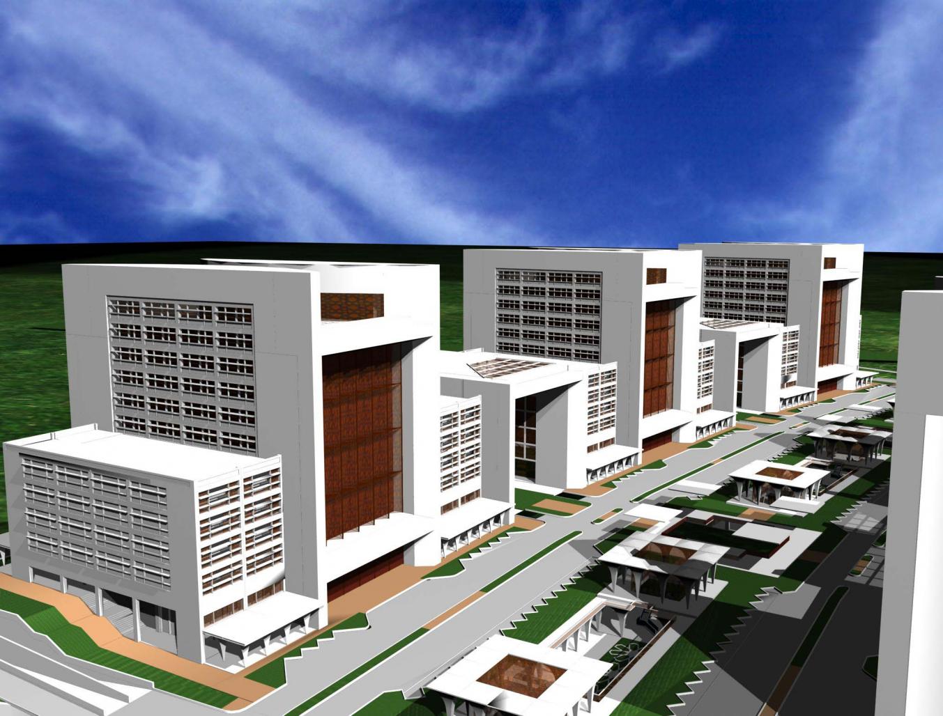 Our proposal featured 2 main concepts; first, a series of repetitive monumental structures reminiscent of entrance gateways or ‘Iwans’, a predominant feature in Islamic architecture in the middle east used as entrance lobbies for public buildings; and second, facades of glazed windows layered with aluminum sun shading architectural screens of various patterns inspired by the concept of ‘Masharabia’ windows of Morocco. These facades contrasted against the white painted walls of corner pylons, structural elements that provide for both aesthetic and practical functions for the scheme. The pylons, positioned at the corners of each ‘Iwan’ and office building, contribute to the predominantly vertical overall outlook while making it possible to have column free interior spaces.