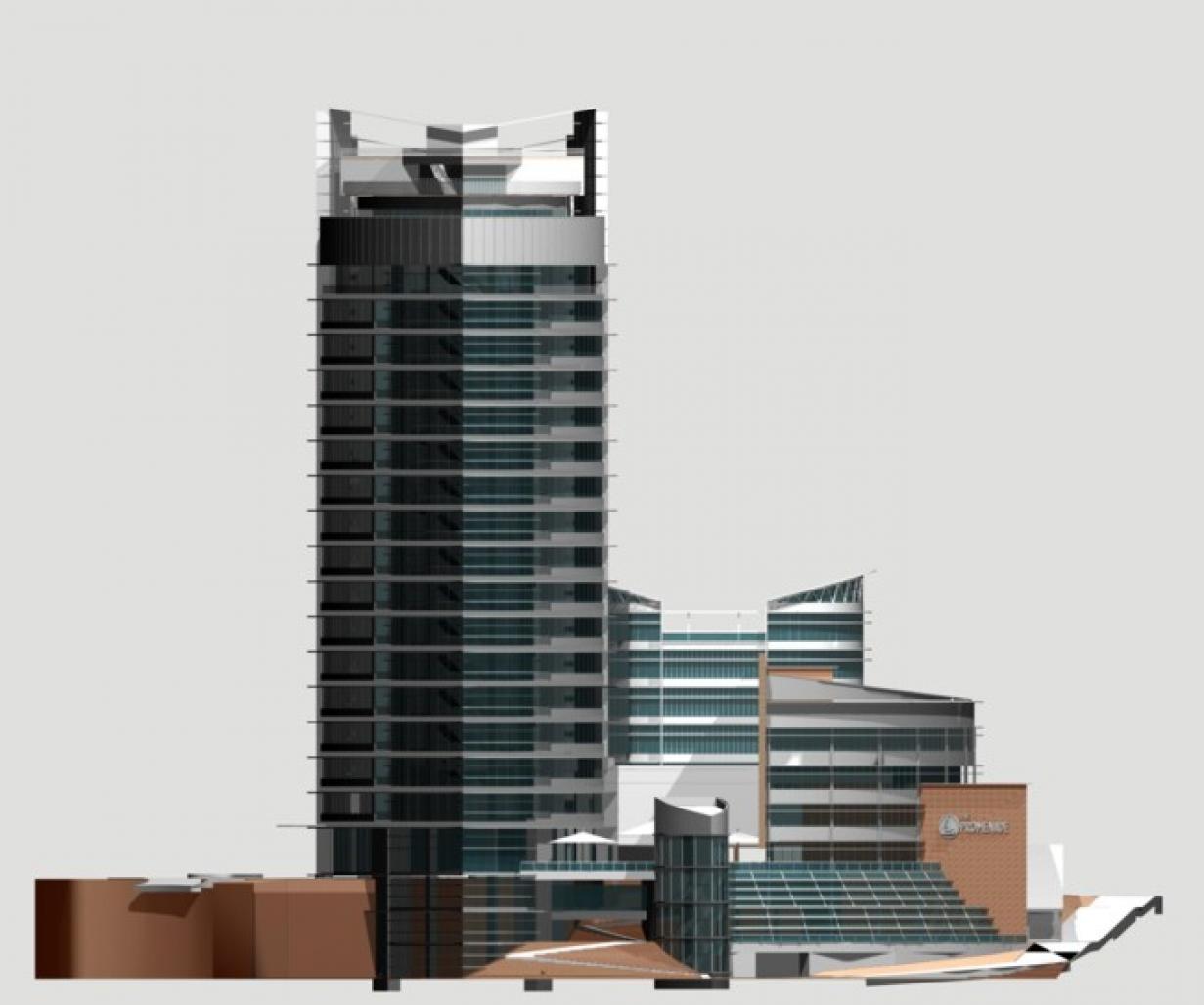 designed based on a modern theme and inspired by maritime elements, the building enclosure is of blue coloured glass combined with passive solar shading devices. the proposed scheme is composed of curvilinear forms aimed at creating visual continuity of the facades when viewed by tourists travelling on boats and ferries across the lake. consisting of a 16 storey office tower and a 4 storey retail area and office suites, these two blocks are linked by a central stepped courtyard which connects the two main access levels. around the courtyard, retail outlets combined with various dining and fast food outlets create a lively ambience which will attract tourists, lunch hour and weekend visitors; a key factor in ensuring the success of this commercial development.