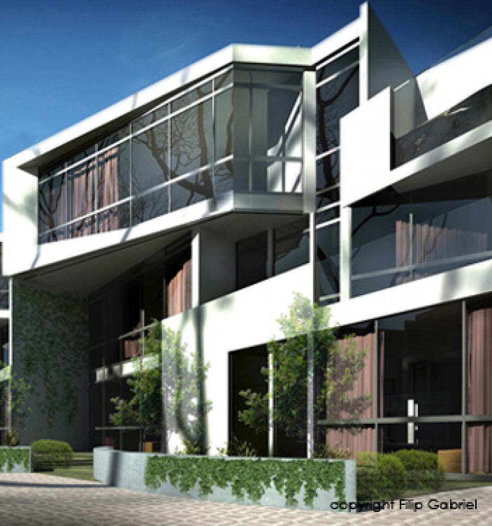 Competition for a coastal row-housing complex. For this project the most important aspects were the preservation of the magnificent view (views from the master bedroom and the pool deck) onto the nearby waters of the Gulf as well as the provision of shade for the lower, most used by day, parts of the living areas. This view shows an individual unit.