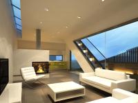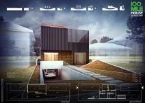 surrounded by an ordinary neighbourhood. Ecological solutions allow using renewable energy sources (sun, water, earth, air). The system of prefabricated structural SIP panels, LED lighting, a tank for rainwater, drainwater heat recovery system, ventilation system with heat recovery, photovoltaic panels and heat pumps are the others technologies used in this house. The materials used in the project are wood, concrete, glass and stone. The facades of the building are finished with a Canadian spruce, architectural concrete and wood blinds.
