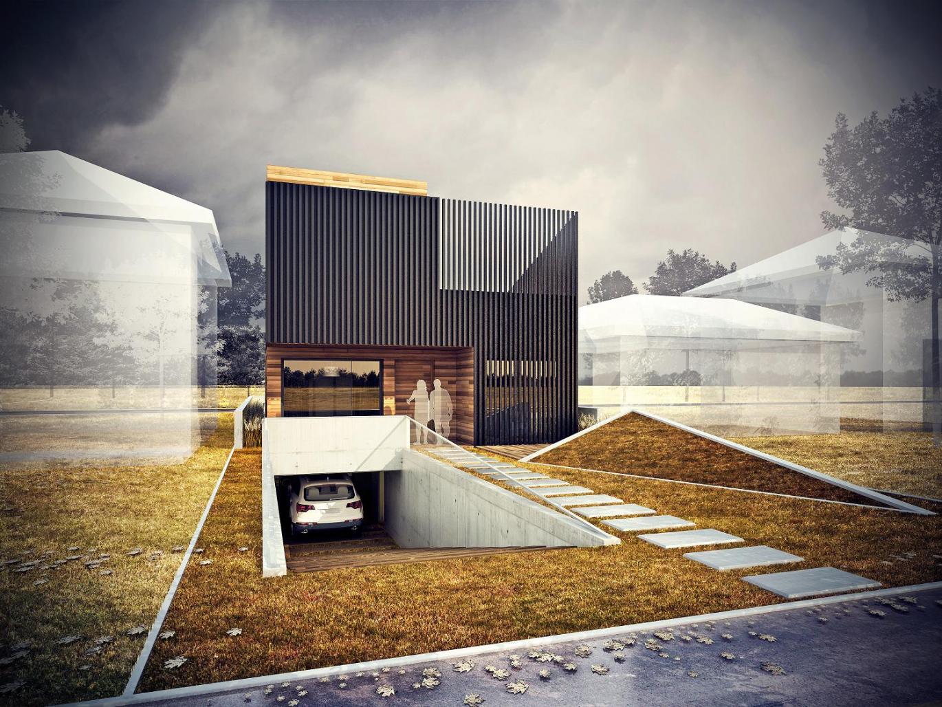 surrounded by an ordinary neighbourhood. Ecological solutions allow using renewable energy sources (sun, water, earth, air). The system of prefabricated structural SIP panels, LED lighting, a tank for rainwater, drainwater heat recovery system, ventilation system with heat recovery, photovoltaic panels and heat pumps are the others technologies used in this house. The materials used in the project are wood, concrete, glass and stone. The facades of the building are finished with a Canadian spruce, architectural concrete and wood blinds.
